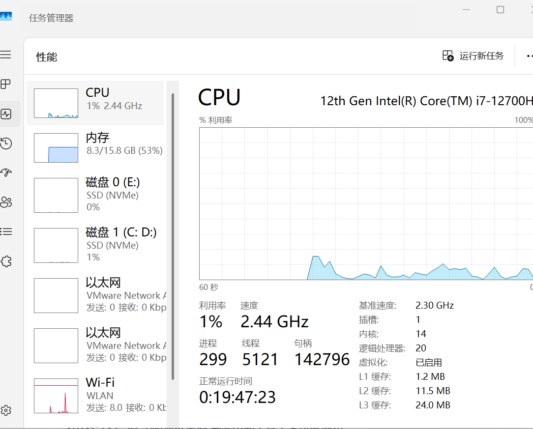 1.打开任务管理器(可以在电脑搜索栏里直接搜索),看虚拟化是否开启,因为我上次处理过这个所以我的虚拟化是开了的,没开启的可以进入BIOS界面选择开启